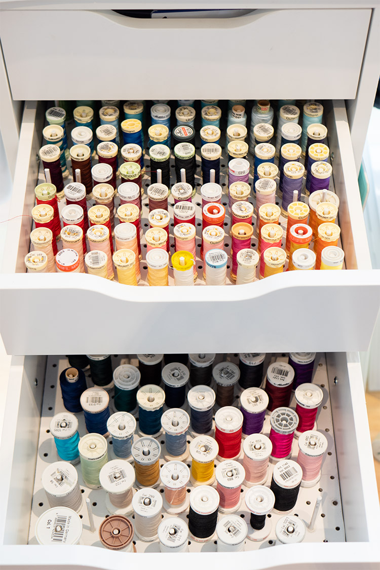 It was time to implement a system that was easy to use but kinder on my thread, so I re-purposed the pegboard on the wall into this super convenient drawer system.