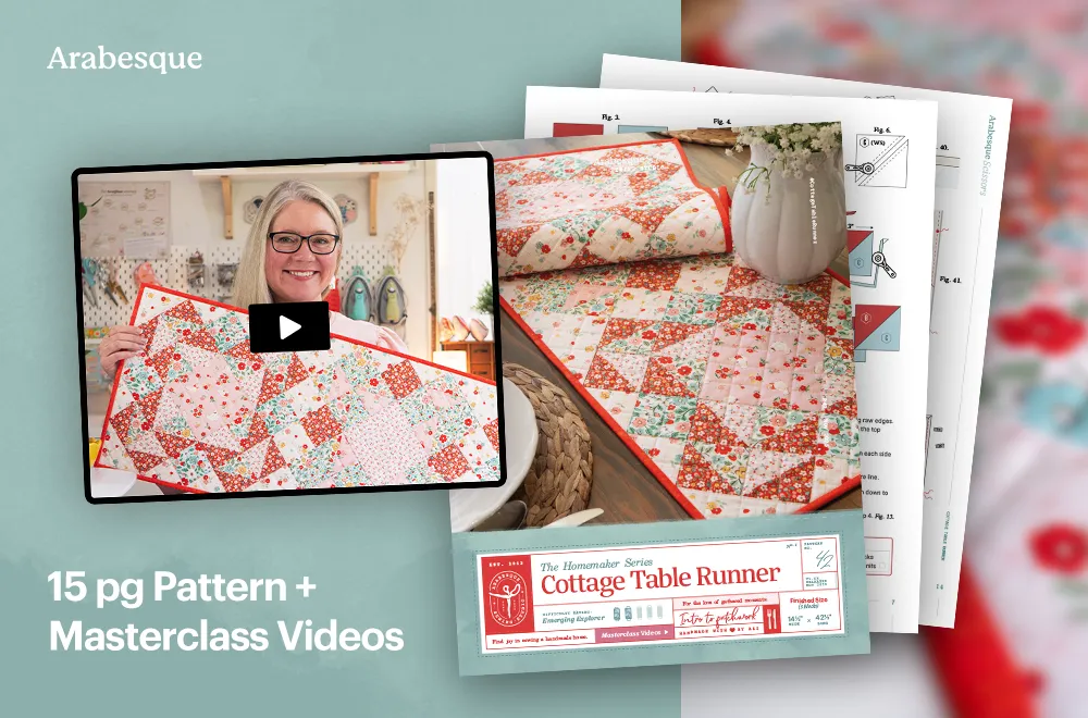 The Cottage Table Runner is your next step after the Placemats — a simple, confidence-building introduction to patchwork. Built from one repeating block, it turns quilting into a calming rhythm that comes together quickly and beautifully.