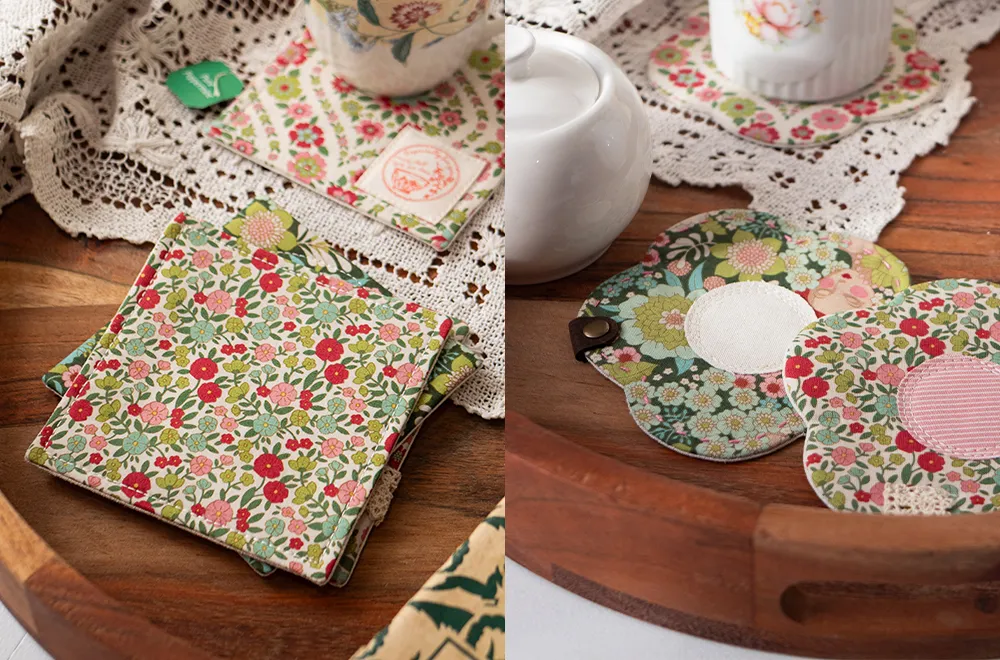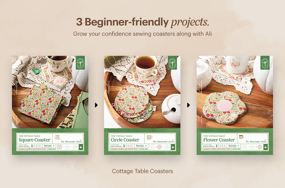 Learn the fundamentals of sewing with this series of 3 sewing projects designed for the beginner sewist. This trio of patterns will build your confidence while you make a charming and practical set of coasters for your home.