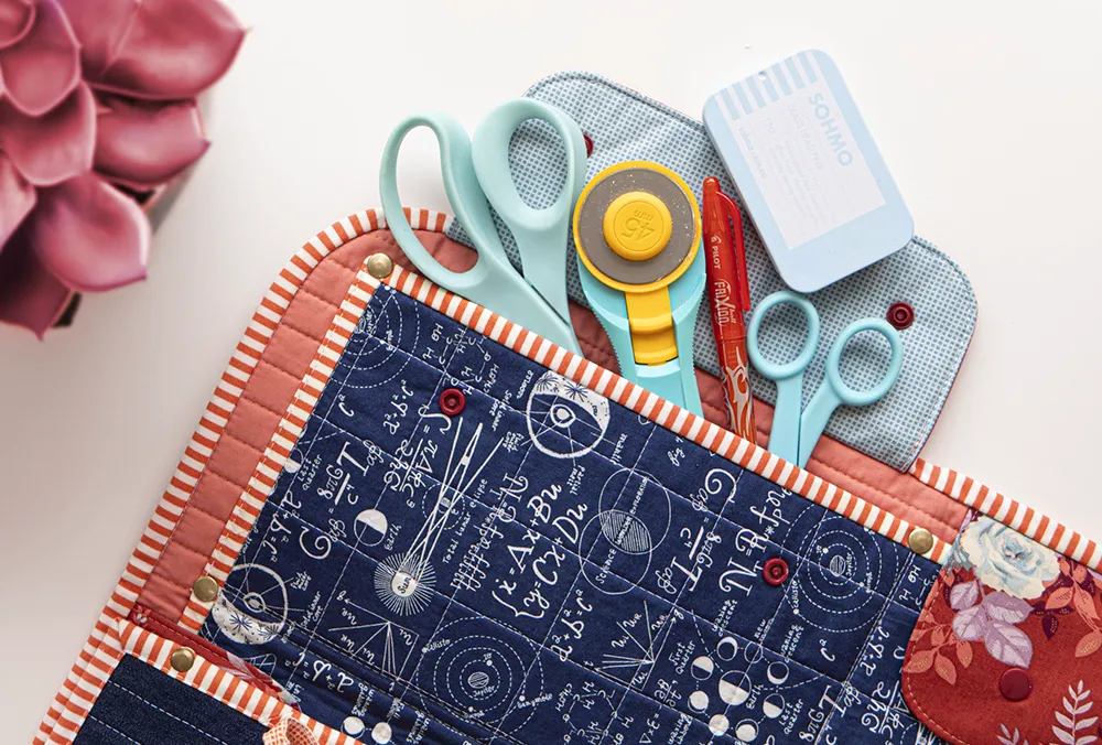 You’ll customise the pockets to suit your craft — hand quilting, EPP, embroidery, crochet and more — then enjoy the ease of a boxed pincushion, needle minder, hidden needle keeper, and tidy storage for scissors, notions, bobbins and clips. When you’re finished, simply fold it up and tuck everything away.
